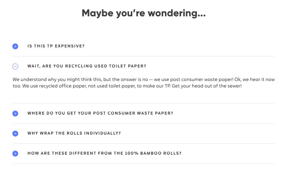So when all the brands were down in the dumps when it came to FAQs I had to turn to… toilet paper. Who Gives a Crap, you’ve done well: